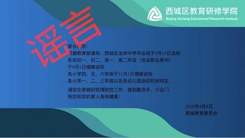 近日,“北京高三4月27日開學,六年級和初三5月11日開學” 、“西城區(qū)全體中學畢業(yè)班5月15日返?!薄ⅰ氨本┠硡^(qū)教委接到通知,確認9月1日前不會復學”等一系列消息在網上流傳。
