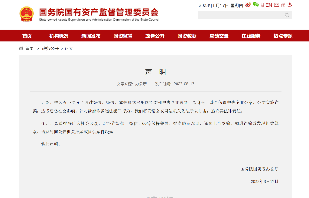 國(guó)務(wù)院國(guó)資委辦公廳8月17日在國(guó)務(wù)院國(guó)資委官網(wǎng)發(fā)布聲明稱(chēng),近期,持續(xù)有不法分子通過(guò)短信、微信、QQ等形式冒用國(guó)務(wù)院國(guó)資委和中央企業(yè)領(lǐng)導(dǎo)干部身份,甚至偽造中央企業(yè)公章、公文實(shí)施詐騙,造成惡劣社會(huì)影響。針對(duì)涉嫌詐騙違法犯罪行為,國(guó)務(wù)院國(guó)資委將商請(qǐng)公安司法機(jī)關(guān)依法予以打擊,追究其法律責(zé)任。