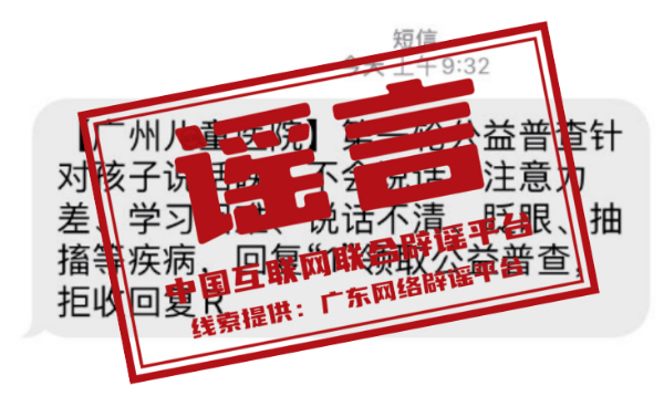真相:近期,有社會醫(yī)療機構(gòu)冒用廣州市婦女兒童醫(yī)療中心(以下簡稱“廣州婦兒中心”)名稱,通過群發(fā)短信的方式,宣傳該中心正在進行“身高普查”“針對孩子說話晚,不會說話、注意力差等”等公益普查項目。對此,廣州婦兒中心發(fā)布聲明稱,目前,該中心未就上述公益普查項目與其他任何醫(yī)療機構(gòu)或社會組織存在合作關(guān)系,也未曾通過短信、電話向廣大患者推送過醫(yī)療信息。特此提醒廣大市民,切勿輕信此類信息,并注意保護個人隱私。(來源:廣東省互聯(lián)網(wǎng)舉報中心)