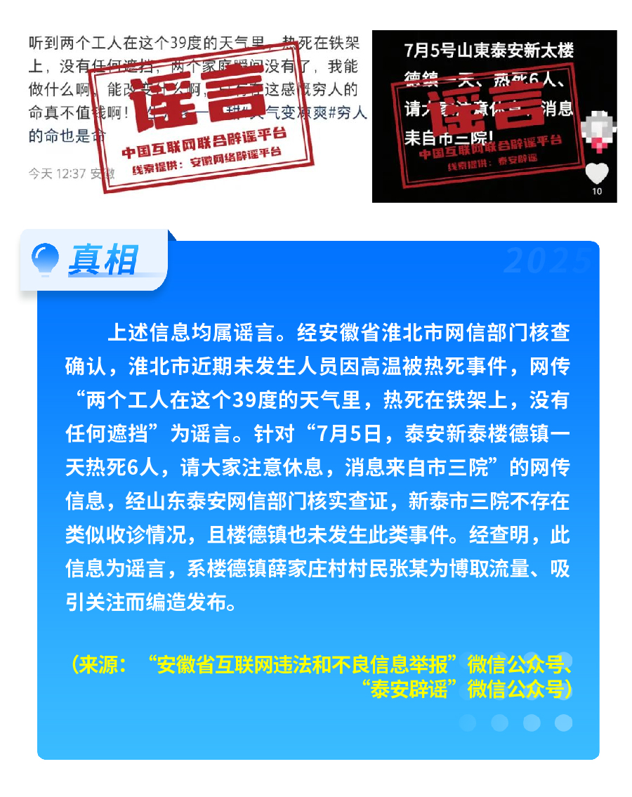 近期,網(wǎng)上接連出現(xiàn)發(fā)布虛假“警情通報(bào)”的惡性造謠傳謠案件,炮制傳播“昆明駕車(chē)撞人案131人死亡”“杭州自來(lái)水接入糞水”及涉釋永信虛假“警情通報(bào)”,模仿“藍(lán)底白字”格式,杜撰聳人聽(tīng)聞細(xì)節(jié),損害政府公信力,嚴(yán)重?cái)_亂社會(huì)秩序?!霸菏款A(yù)測(cè)廣東將發(fā)生8級(jí)以上大地震”公然偽造專(zhuān)家聊天截圖,謊報(bào)地震預(yù)警。還有造謠者借盛夏高溫酷暑與洪澇災(zāi)害,編造“安徽淮北、山東泰安等地多人因高溫死亡” “重慶大暴雨導(dǎo)致15人死亡、4人失蹤”等謠言,蹭炒熱點(diǎn)、煽動(dòng)情緒。