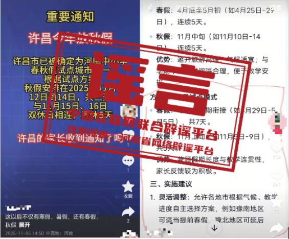 真相:近日,河南、安徽部分自媒體平臺(tái)發(fā)布關(guān)于中小學(xué)春秋放假的信息,聲稱“許昌市已被確定為河南中小學(xué)春秋假試點(diǎn)城市之一”“周口市中小學(xué)2025年秋假時(shí)間安排如下”“蕪湖市中小學(xué)將在11月12日至14日放首個(gè)秋假,連周末共5天”,引發(fā)關(guān)注。對(duì)此,河南許昌、周口及安徽蕪湖教育部門作出回應(yīng):并無(wú)放秋假的安排,網(wǎng)傳消息均為謠言。中小學(xué)放假安排需嚴(yán)格遵循國(guó)家教育方針政策及當(dāng)?shù)亟逃块T的統(tǒng)一部署,結(jié)合本地教育教學(xué)實(shí)際統(tǒng)籌規(guī)劃。如需了解相關(guān)安排,請(qǐng)通過屬地教育部門官方網(wǎng)站,切勿輕信、傳播未經(jīng)官方確認(rèn)的“小道消息”。(來(lái)源:“清朗河南”微信公眾號(hào)、@大河網(wǎng)、安徽網(wǎng)絡(luò)辟謠平臺(tái))