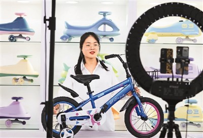 河北省邢臺市廣宗縣鐵牛自行車業(yè)有限公司的工作人員日前通過線上廣交會直播推介童車產品。王 壘攝(人民圖片)