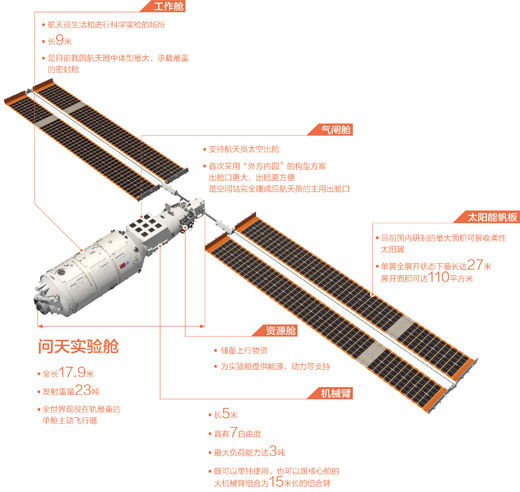 結(jié)構(gòu)上,問(wèn)天實(shí)驗(yàn)艙由用來(lái)完成科學(xué)實(shí)驗(yàn)的工作艙、支持太空出艙的氣閘艙及儲(chǔ)備上行物資的資源艙3部分組成。