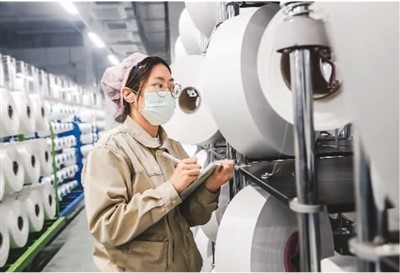 江蘇省宿遷市泗陽縣近年來加快推動紡織企業(yè)生產(chǎn)數(shù)字化轉(zhuǎn)型,實現(xiàn)高質(zhì)量發(fā)展。圖為江蘇芮邦科技有限公司生產(chǎn)車間內(nèi),工人在智能化生產(chǎn)線上作業(yè)。裴 成攝(人民視覺)
