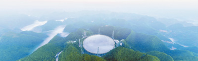 層巒疊嶂,翠林如海。在貴州省平塘縣的大山之間,一座恢弘大氣的單口徑球面射電望遠鏡靜靜佇立,凝望星空,帶著人類的好奇和期待,探尋百億光年之外的射電信號。