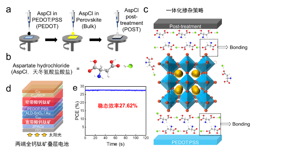 為此,研究團隊將天冬氨酸鹽酸鹽引入到全鈣鈦礦疊層太陽能電池底部的空穴傳輸層、鈣鈦礦體吸光層和上界面層中,開發(fā)了一種采用同一分子處理的一體化摻雜策略,極大地改善了鈣鈦礦薄膜的質量。除了與鈣鈦礦前驅體配位外,天冬氨酸鹽酸鹽分子還具有很強的分子間氫鍵,富集在鈣鈦礦上、下界面處的天冬氨酸鹽酸鹽因此充當了鈣鈦礦層和傳輸層界面之間的分子鎖,進一步提升了鈣鈦礦材料的性能和穩(wěn)定性。