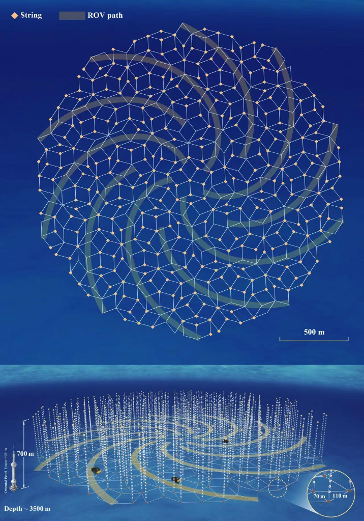 根據(jù)設(shè)計,這些線纜像巨型海藻一樣垂直地錨定于海床上,每根長約700米,互相間距70米至110米。每根線纜搭載約20個光學(xué)探測球艙,如同深海中的一串串鈴鐺,靜待高能中微子的到來。
