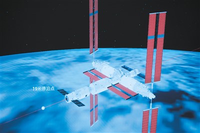 天舟七號貨運飛船與空間站組合體進行交會對接的模擬圖像。新華社發(fā)