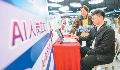 日前,在福建省福州市鼓樓區(qū)安泰街道南門兜地鐵站里舉行的2025年就業(yè)援助月專項活動中,工作人員利用AI技術和大數(shù)據(jù)分析等先進技術,為求職者提供智能化的崗位匹配和職業(yè)規(guī)劃建議。謝貴明攝(人民視覺)