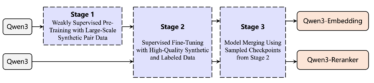 向量模型像是AI的“翻譯器”,它可以將文本、圖片等人類(lèi)可認(rèn)知的非結(jié)構(gòu)化信息,映射到機(jī)器更易理解的向量空間,再基于這些向量實(shí)現(xiàn)高效的信息分類(lèi)、檢索或排序。也正因此,向量模型對(duì)于提升AI的語(yǔ)義理解、信息檢索、多模態(tài)融合等核心能力至關(guān)重要?;谇?wèn)3模型,通義團(tuán)隊(duì)通過(guò)對(duì)比訓(xùn)練、SFT、模型融合等方法,打造出全新的千問(wèn)3向量模型,包含文本嵌入模型 Qwen3-Embedding以及文本排序模型Qwen3-Reranker。