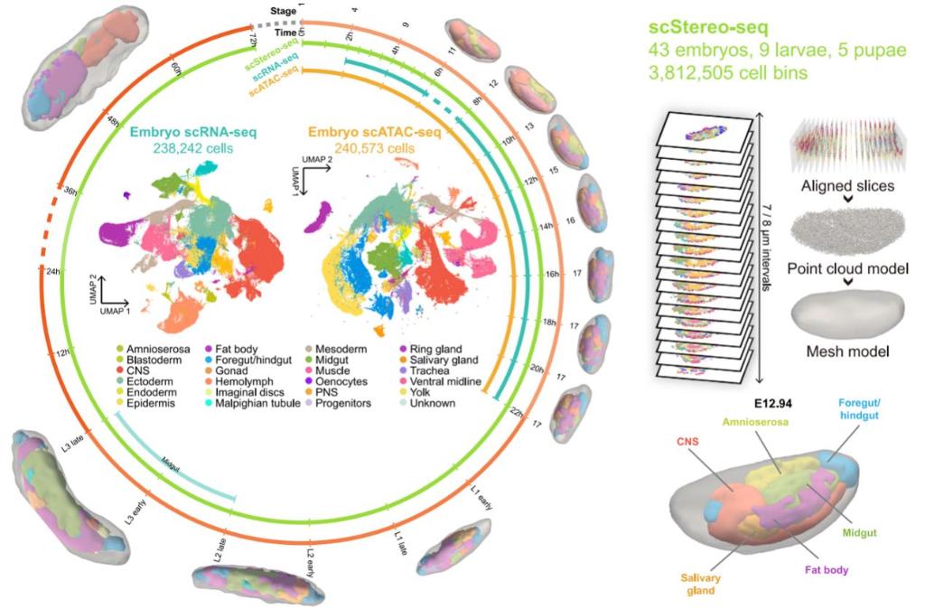 杭州華大生命科學研究院與南方科技大學創(chuàng)建了一個解碼動物發(fā)育過程的多模態(tài)數(shù)據(jù)集,生成了果蠅全發(fā)育周期的3D單細胞時空多組學圖譜,為生物發(fā)育提供了分子層面的參考,有望為發(fā)育缺陷及相關(guān)疾病機制研究奠定基礎(chǔ)。相關(guān)成果26日發(fā)表于國際學術(shù)期刊《細胞》。