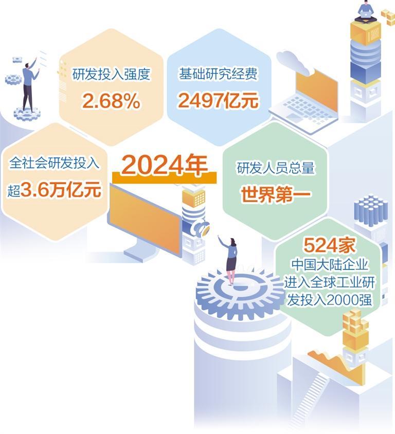 科技投入持續(xù)增加。2024年全社會(huì)研發(fā)投入超3.6萬億元,較2020年增長(zhǎng)48%;研發(fā)投入強(qiáng)度達(dá)2.68%,超過歐盟國(guó)家平均水平;研發(fā)人員總量世界第一?;A(chǔ)研究經(jīng)費(fèi)達(dá)2497億元,較2020年增長(zhǎng)超過70%,在量子科技、生命科學(xué)、物質(zhì)科學(xué)、空間科學(xué)等領(lǐng)域取得一批重大原創(chuàng)性成果,高水平國(guó)際期刊論文數(shù)量和國(guó)際專利申請(qǐng)量連續(xù)5年世界第一。