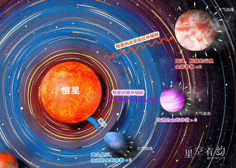 研究發(fā)現(xiàn),低質(zhì)量系外行星的流體大氣逃逸可以由行星內(nèi)能、恒星潮汐力拉拽或恒星的極端紫外輻射加熱單獨(dú)或共同驅(qū)動。在該項研究之前,研究人員需要依賴復(fù)雜的模型來判斷一顆行星上的流體逃逸究竟是由哪種物理機(jī)制驅(qū)動,且得到的最終結(jié)論往往并不明確。借助郭建恒主導(dǎo)的這項研究成果,僅使用恒星和行星的基本物理參數(shù),如質(zhì)量、半徑和軌道距離等就可對低質(zhì)量行星流體大氣逃逸機(jī)制做出分類。