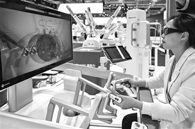 參會者在第七屆進博會醫(yī)療器械及醫(yī)藥保健展區(qū)體驗操作一款外科手術(shù)機器人。(資料照片)
