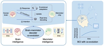 天津大學(xué)與清華大學(xué)的聯(lián)合研究團(tuán)隊(duì)針對這一難題,發(fā)現(xiàn)腦電信號(hào)的非平穩(wěn)特性與任務(wù)腦電演變密切相關(guān)?;诖?,他們創(chuàng)新性地提出了“雙環(huán)路腦機(jī)協(xié)同演進(jìn)框架”,并通過憶阻器神經(jīng)形態(tài)器件加以實(shí)現(xiàn)。在“雙環(huán)路”框架下,腦與機(jī)的學(xué)習(xí)環(huán)路相互協(xié)同,共同促進(jìn)系統(tǒng)性能的提升。