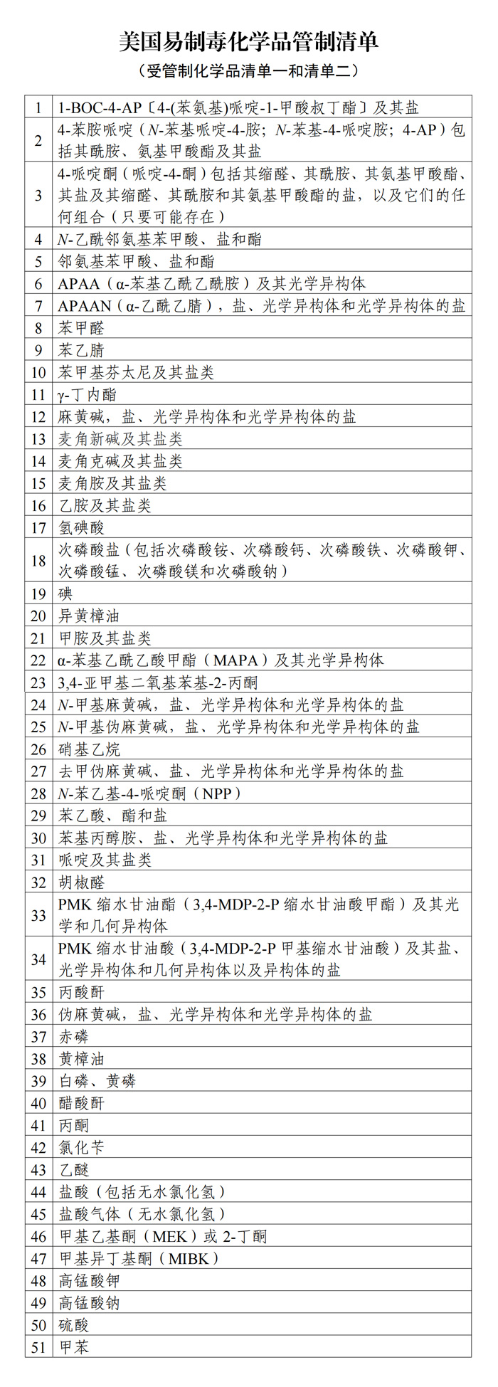 8.涉及美國(guó)管制化學(xué)品(品種詳見(jiàn)附件)的生產(chǎn)、經(jīng)營(yíng)、進(jìn)出口企業(yè)和個(gè)人應(yīng)謹(jǐn)慎對(duì)待來(lái)自美國(guó)和墨西哥等相關(guān)國(guó)家的訂單,警惕出口物品被用于制造毒品和可能面臨的“長(zhǎng)臂管轄”甚至“釣魚執(zhí)法”的風(fēng)險(xiǎn)。