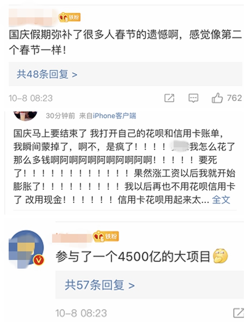 不少網友開始討論“十一”黃金周消費情況。微博截圖