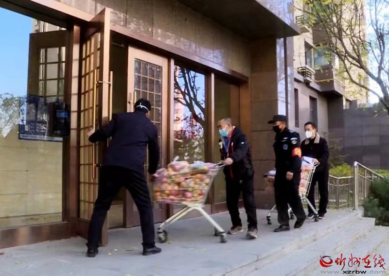 大批裝袋整齊的水果包放在濱河一號小區(qū)樓下,多名物業(yè)工作人員推著便民購物車來回忙碌著,大家統(tǒng)一佩戴口罩,嚴格做好防護措施,挨家挨戶送貨上門,并全程避免與業(yè)主接觸,最大限度地保護廣大群眾的健康與安全。