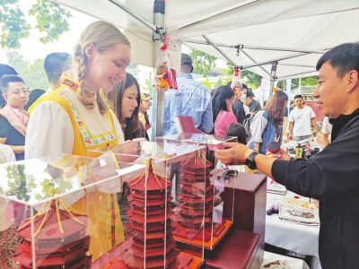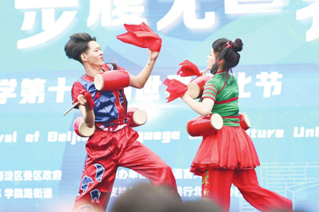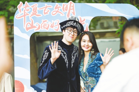 當(dāng)日活動(dòng)吸引了來(lái)自世界各地的3萬(wàn)余名師生及社會(huì)各界人士。獨(dú)唱《人說(shuō)山西好風(fēng)光》《千年一塔》,舞蹈《醋之韻》《翼城花鼓》等贏得師生們熱烈掌聲。在五大洲文化展區(qū),絳州木版年畫(huà)傳承人吳百鎖現(xiàn)場(chǎng)印制木版年畫(huà)贈(zèng)送師生,成為一道亮麗風(fēng)景。廣靈剪紙、應(yīng)縣木塔模型、黎侯虎、寧武毛健茶等吸引各國(guó)留學(xué)生駐足欣賞?!叭A夏古文明山西好風(fēng)光”主題相框前,無(wú)數(shù)外國(guó)友人饒有興趣交流互動(dòng),拍照留念?!吧轿髟亍被鸨本┱Z(yǔ)言大學(xué)世界文化節(jié)。