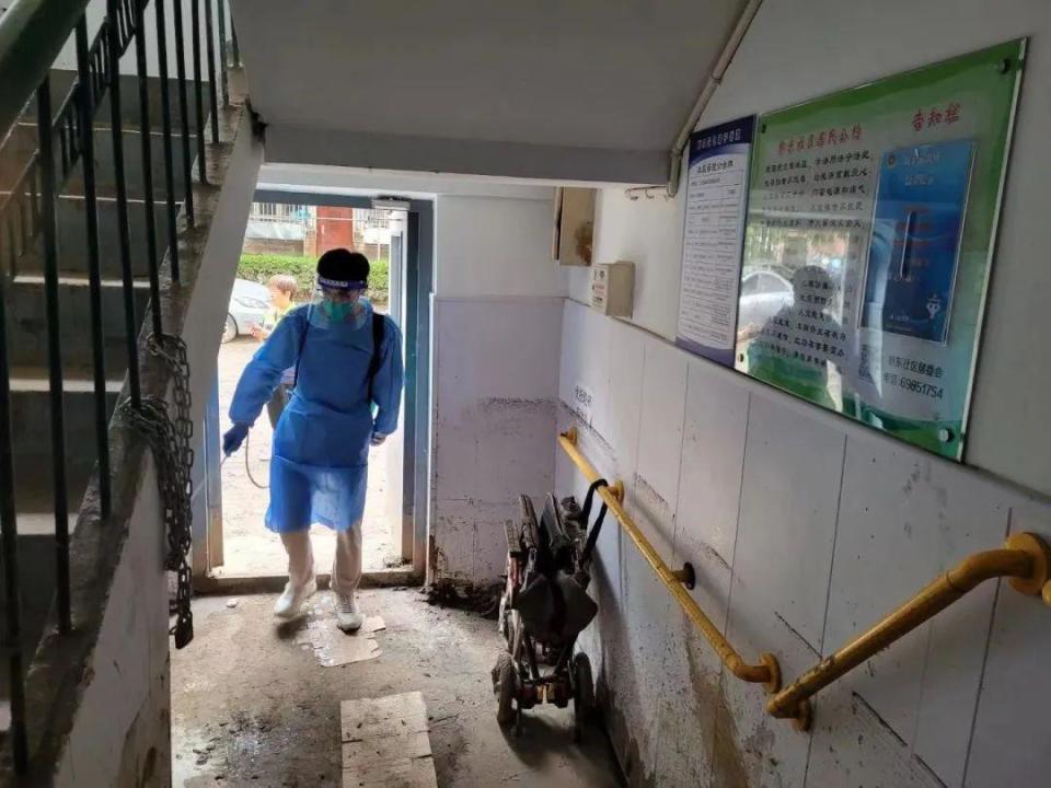 “益行志愿服務(wù)隊(duì)從8月4日17點(diǎn)下班后開始組織救災(zāi)工作,到凌晨24點(diǎn)充分準(zhǔn)備完畢??傆?jì)出動(dòng)9輛汽車,志愿者們對(duì)社區(qū)內(nèi)的一樓單元門口、垃圾分類驛站、居民家里、黨群活動(dòng)中心、居委會(huì)物資庫、社區(qū)花園內(nèi)和道路,開展清理淤泥和清洗路面工作?!睆垈惤榻B道。