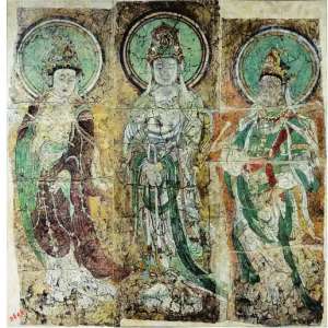 在中國廳中央墻上有幾十平方米的敦煌壁畫,其割痕雖猶可見,卻難掩其久遠的鮮麗及三位“濃麗豐肥”菩薩的雍容華貴。