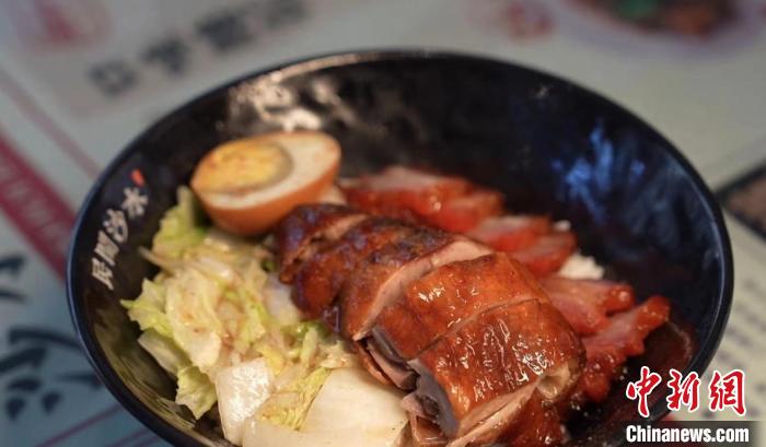 店內(nèi)靠街邊一角,港式燒臘明檔會(huì)出品咸蛋叉燒、燒鵝等港式產(chǎn)品。港式燒臘加長沙米粉的組合,不僅讓許多長沙人贊不絕口,也吸引眾多在湘生活的港人聞香而來。