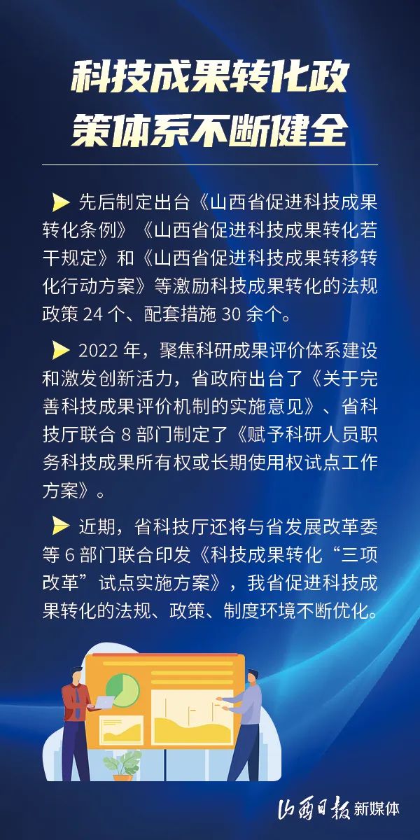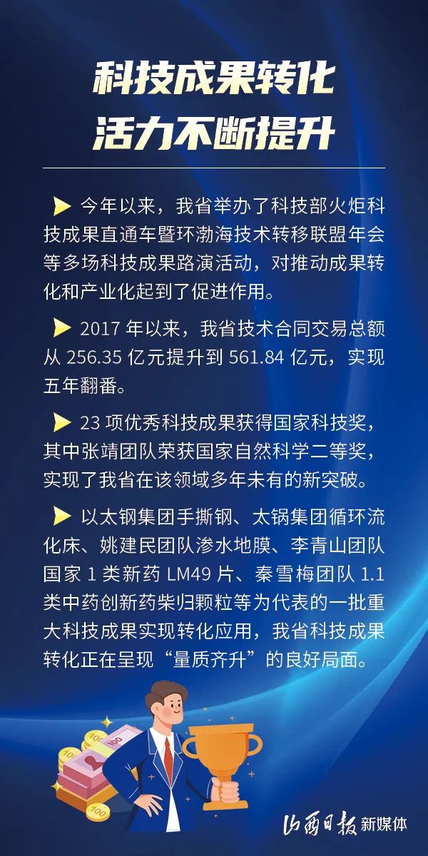 制定出臺激勵科技成果轉(zhuǎn)化法規(guī)政策24個、技術(shù)合同交易總額實現(xiàn)五年翻番、科技成果轉(zhuǎn)化引導(dǎo)專項五年累計投入2.21億元……近年來,我省科技成果轉(zhuǎn)化堅持新發(fā)展理念,加速科技成果在晉落地轉(zhuǎn)化和產(chǎn)業(yè)化,取得顯著成效。
