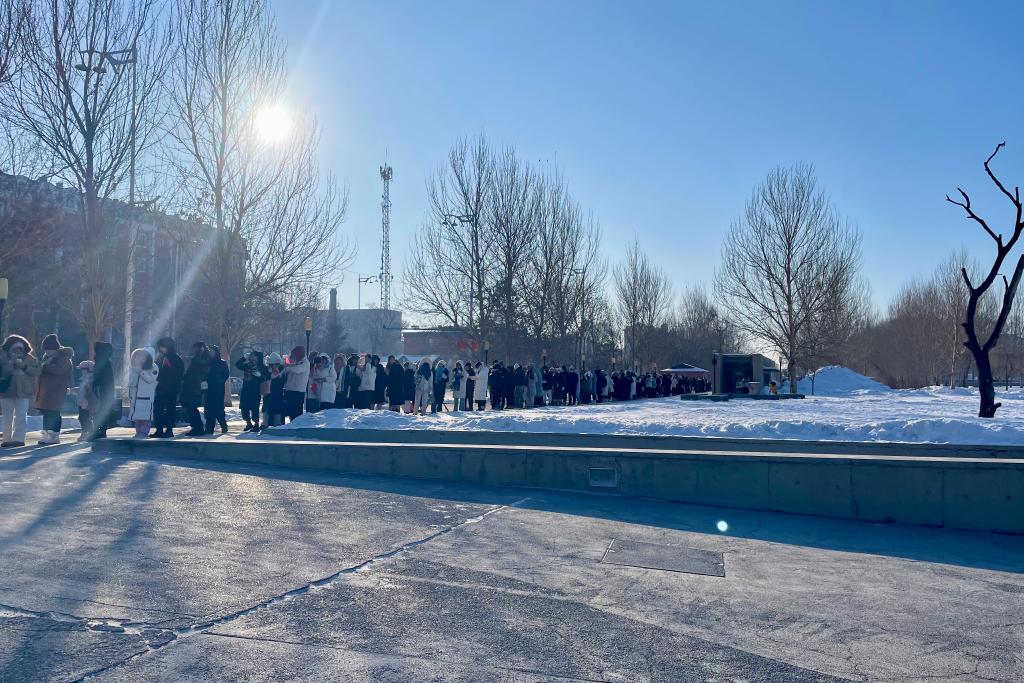 9日早上,哈爾濱氣溫低至零下20攝氏度,陳列館外早已排起長隊。為了迎接高峰,陳列館延長開放時間,游客通過網(wǎng)上預約可免費入館參觀,還有志愿者送上熱水或玉米糊幫他們驅(qū)寒。