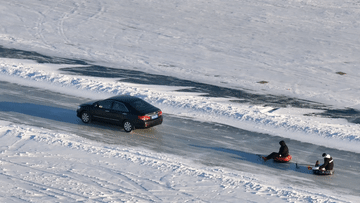 拖拉機(jī)拉著雪圈起舞旋轉(zhuǎn)