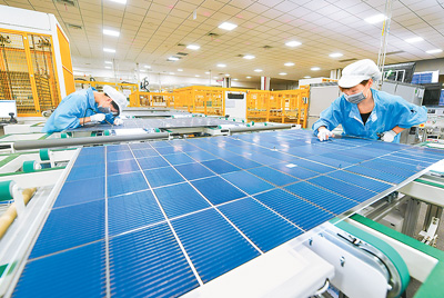 圖為安徽華晟新能源科技股份有限公司的異質(zhì)結(jié)光伏電池及組件工廠內(nèi),技術(shù)人員在對(duì)產(chǎn)品進(jìn)行檢測。徐 勇攝(新華社發(fā))