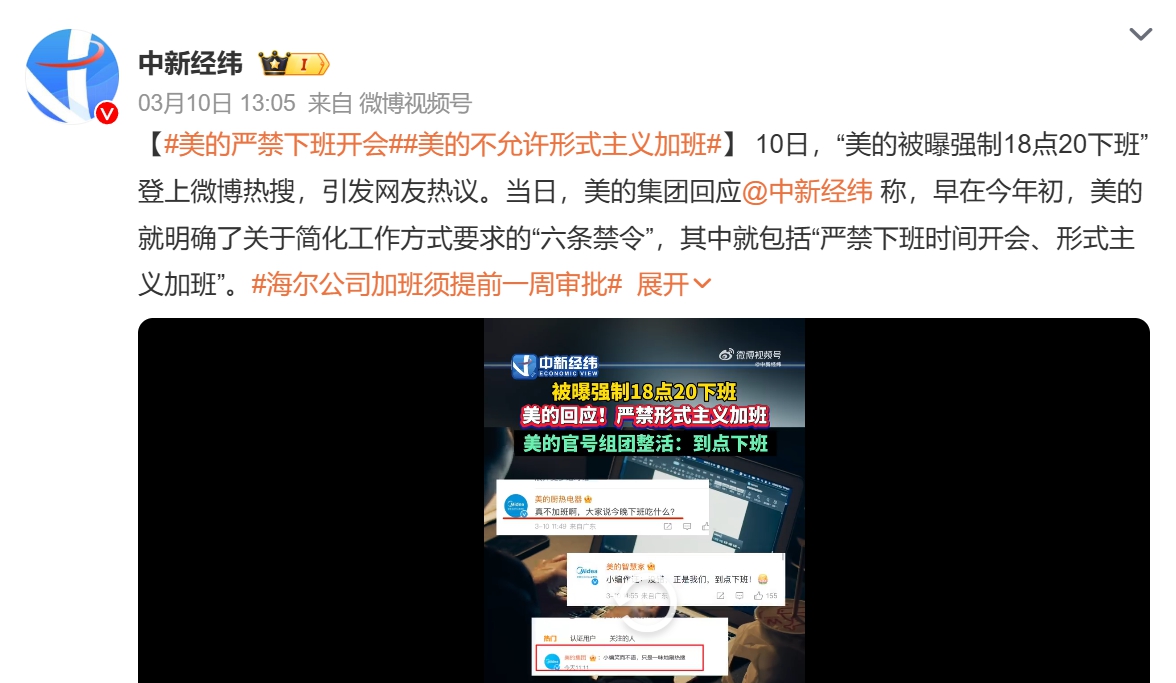 美的回應(yīng)媒體時(shí)表示,今年以來,美的明確了關(guān)于簡化工作方式要求的“六條禁令”,其中就包括“嚴(yán)禁下班時(shí)間開會、形式主義加班”。