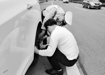 5月3日,山西高速交警一支隊六大隊民警巡邏時,發(fā)現(xiàn)一輛轎車在高速公路上行駛時突然爆胎,車主不得已將車停在路邊。高速交警首先對現(xiàn)場進行了安全防護,發(fā)現(xiàn)車輛的一個輪胎已經(jīng)徹底破損,交警與司機一起更換了輪胎。