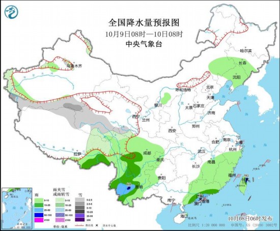 圖2 全國降水量預(yù)報圖(10月9日08時-10日08時)