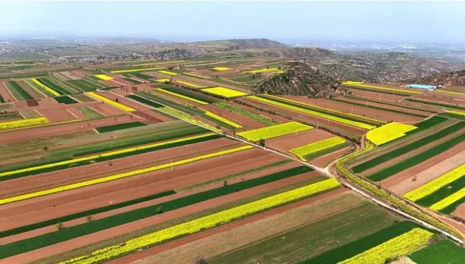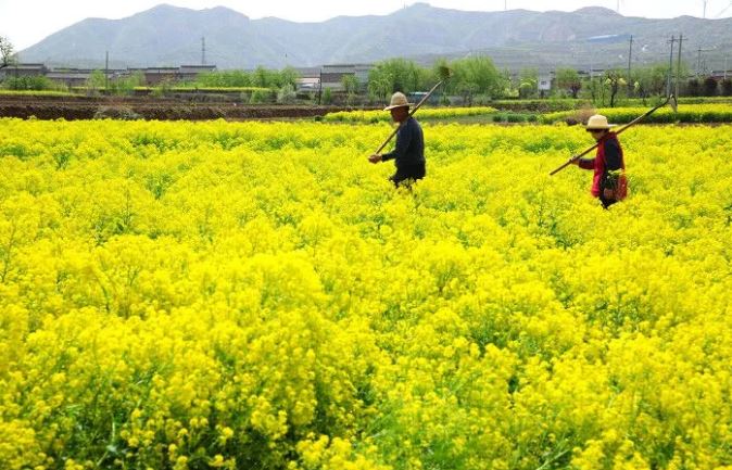 4月14日,在萬榮縣西村鄉(xiāng)望囑村的板藍根花地里游人在踏青賞花,親近自然。西村鄉(xiāng)到處都是板藍根花開放,競相爭艷,連成一片花?!?/p>