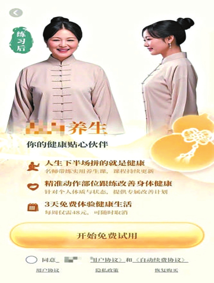 還有些App則更加離譜,下載完成后,點進去的第一步就是要購買會員,之后才能正常使用。但在購買流程上,平臺卻耍起了花招。比如一款提供“養(yǎng)生指導(dǎo)服務(wù)”的App,頁面上會有一個大大的按鈕,寫著“開始免費試用”。但在按鈕的旁邊,卻有一行非常不起眼的小字:“每周僅需48元,可隨時取消?!倍坏┯脩酎c擊開始試用,系統(tǒng)就會跳轉(zhuǎn)到自動續(xù)費的開通界面。如果是辨別能力差的老人,可能還以為是在填寫什么注冊信息。