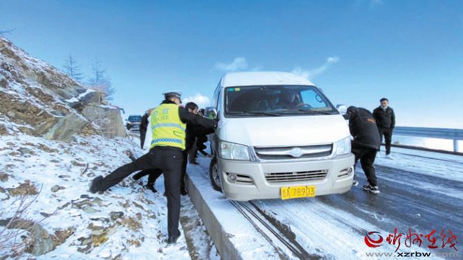 10月16日,五臺(tái)山景區(qū)境內(nèi)出現(xiàn)雨夾雪天氣,伴隨著氣溫下降,部分路段出現(xiàn)積雪。當(dāng)日7時(shí)許,五臺(tái)山公安分局接到游客報(bào)警稱,在景區(qū)北線鴻門(mén)巖路段,由于下雪后道路有大量積雪成冰,導(dǎo)致多輛大巴車和轎車受阻無(wú)法通行,請(qǐng)求援助。