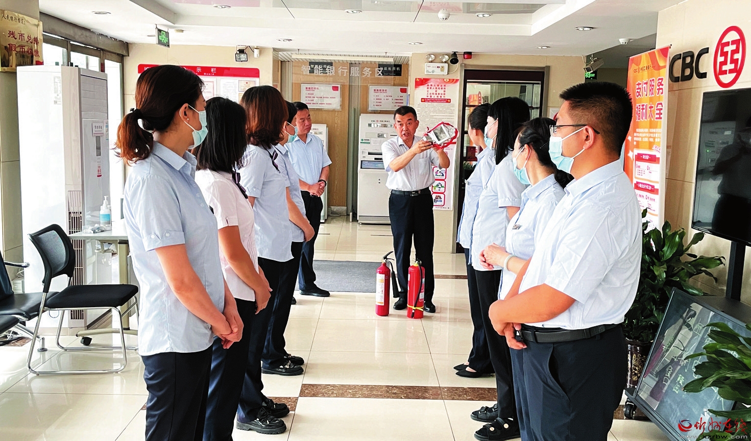 為增強(qiáng)員工的消防意識和避險自救能力,近日,工行忻州和平街支行舉辦了2022年度夏季消防安全培訓(xùn)。培訓(xùn)內(nèi)容通俗易懂、操作性強(qiáng),力求讓大家做到“四懂四會”,即懂本崗位的火災(zāi)危險性、懂預(yù)防火災(zāi)的措施、懂滅火方法、懂逃生方法;會報警、會使用消防器材、會撲救初起火災(zāi)、會組織人員疏散逃生。圖為專業(yè)人士現(xiàn)場演示了干粉滅火器等消防器材的使用方法,講解了火災(zāi)事故的處理方法等。(班如喜 攝)