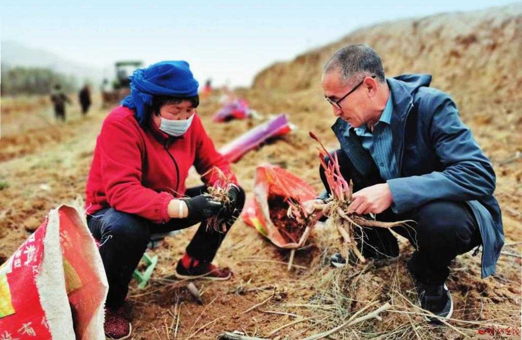 近日,五臺(tái)縣陽(yáng)白鄉(xiāng)桑院村北部嶺坡地種植的大片芍藥進(jìn)入收獲季。村黨支部書記、村委會(huì)主任李肖峰帶領(lǐng)村民忙著機(jī)械采挖、分級(jí)歸類、拾撿裝運(yùn)、晾曬、銷售等,田間地頭一派忙碌景象。多年來(lái),陽(yáng)白鄉(xiāng)黨委政府不斷調(diào)整農(nóng)業(yè)產(chǎn)業(yè)結(jié)構(gòu),通過(guò)鼓勵(lì)農(nóng)民種植芍藥、黃芩、黃芪等中藥材,帶動(dòng)當(dāng)?shù)厝罕娫鍪罩赂?。上圖為機(jī)械采挖場(chǎng)景;下圖為李肖峰為村民講解藥材分級(jí)歸類注意事項(xiàng)。(王金龍攝)