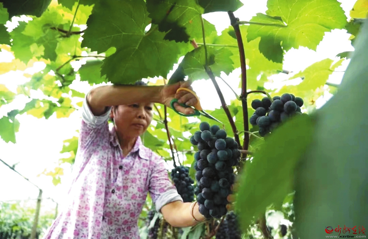 走進(jìn)葡萄大棚,一排排葡萄架整整齊齊,架上綴滿(mǎn)的,便是今天的主角——“夏黑”葡萄了。只見(jiàn)一串串珠圓玉潤(rùn)、晶瑩剔透的葡萄,沉甸甸地掛滿(mǎn)枝頭,讓人垂涎欲滴。沿著畦間往里,一串串葡萄迎面而來(lái),像一場(chǎng)盛大的表演,你方唱罷我登場(chǎng),像珠寶店價(jià)值連城的上等珍珠,爭(zhēng)著奇、斗著艷,又像棲在枝頭上的鳥(niǎo)雀?jìng)?,嘰嘰喳喳地聊個(gè)不?!r(nóng)正帶著游客們采摘,大家左看看、右看看,相中了就剪下來(lái)裝箱。閑聊間,隨手摘下來(lái)一顆丟進(jìn)口中:真甜!