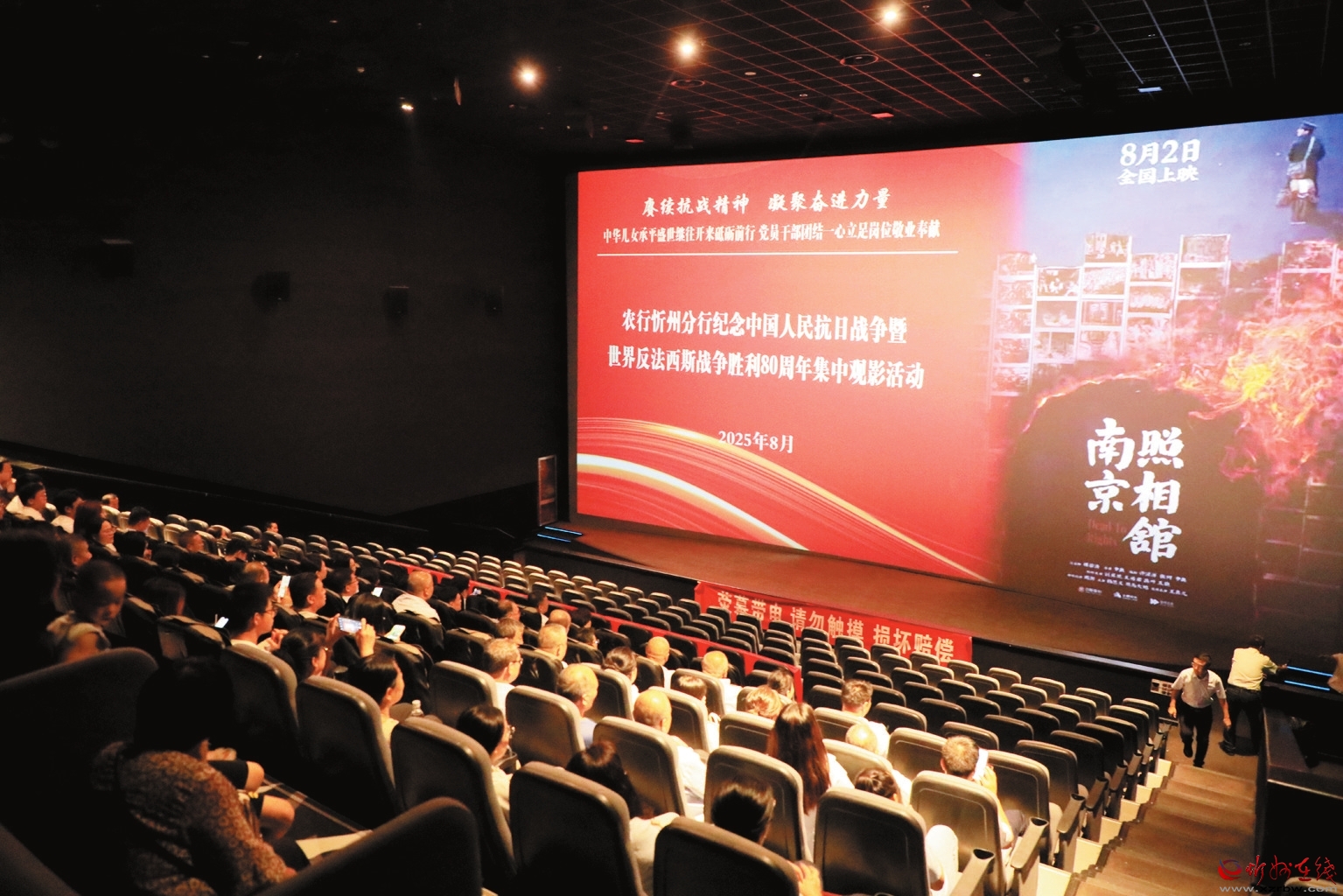 為紀(jì)念中國人民抗日戰(zhàn)爭暨世界反法西斯戰(zhàn)爭勝利80周年,8月22日,農(nóng)行忻州分行組織市分行機關(guān)及城區(qū)支行的黨員干部聯(lián)合開展了以“賡續(xù)抗戰(zhàn)精神,凝聚奮進力量”為主題的黨日活動,并集體觀看了電影《南京照相館》。(殷俊攝)