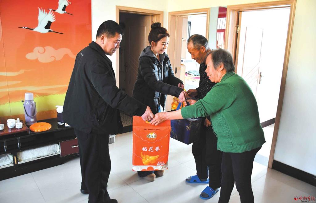 春節(jié)期間,五臺縣北一村到村工作大學(xué)生趙雪婷(左二)自費(fèi)購買大米、食用油、牛奶等,和村委會干部來到78歲退伍軍人王還吉家中進(jìn)行慰問,并與老人促膝談心,鼓勵(lì)剛經(jīng)歷喪子之痛的老兩口振作起來,好好生活。(王金龍 攝)