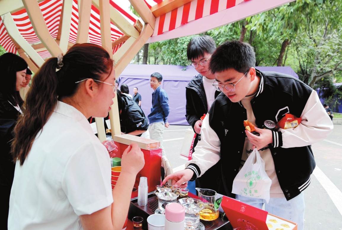 我市在清華大學(xué)國(guó)防教育林舉辦秋季學(xué)期學(xué)生地域文化節(jié)暨“人到山西好風(fēng)光”忻州專場(chǎng)活動(dòng)。圖為清華大學(xué)學(xué)生品嘗毛建茶。本報(bào)記者范琛攝