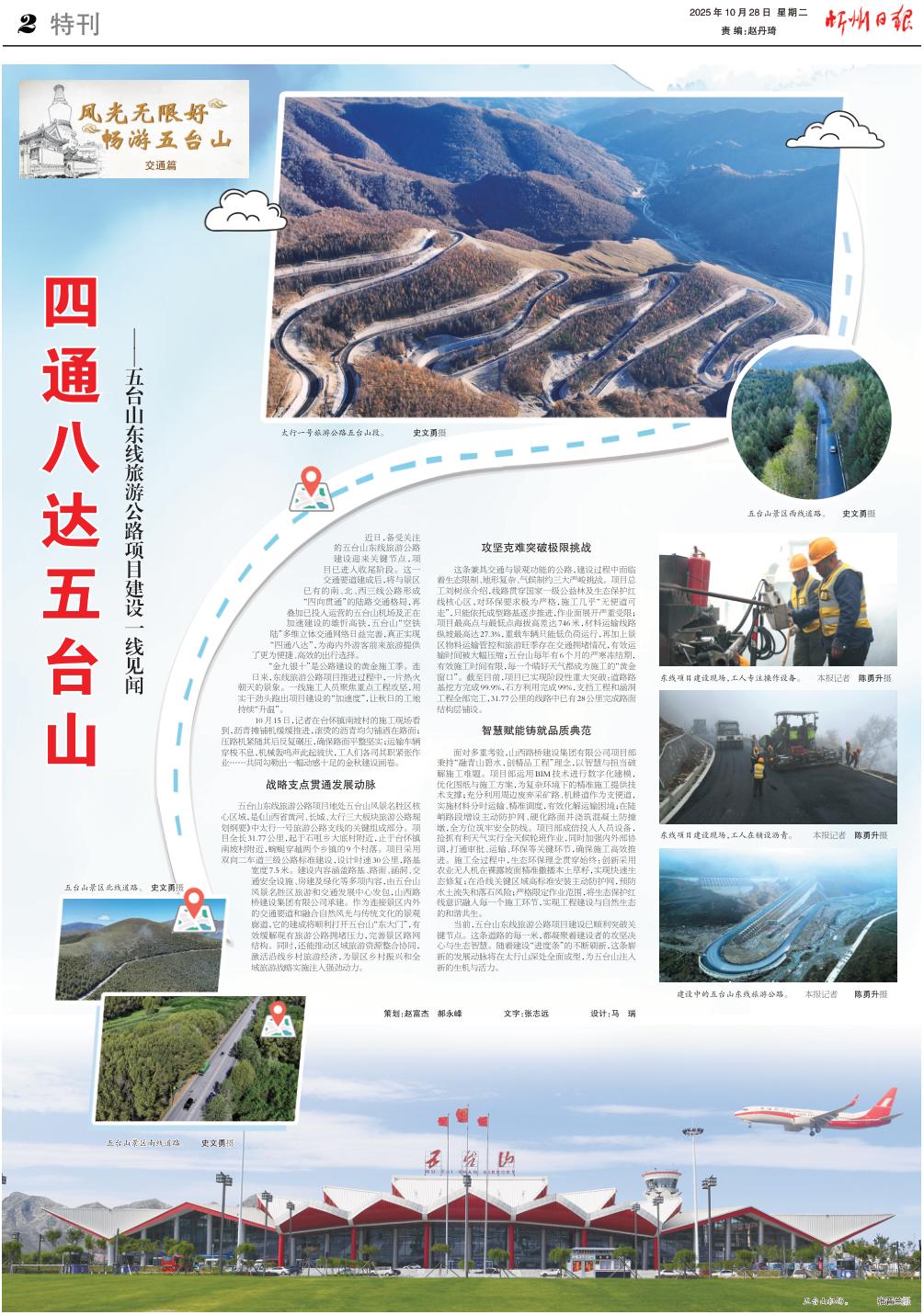 近日,備受關(guān)注的五臺山東線旅游公路建設迎來關(guān)鍵節(jié)點,項目已進入收尾階段。這一交通要道建成后,將與景區(qū)已有的南、北、西三線公路形成“四向貫通”的陸路交通格局,再疊加已投入運營的五臺山機場及正在加速建設的雄忻高鐵,五臺山“空鐵陸”多維立體交通網(wǎng)絡日益完善,真正實現(xiàn)“四通八達”,為海內(nèi)外游客前來旅游提供了更為便捷、高效的出行選擇。