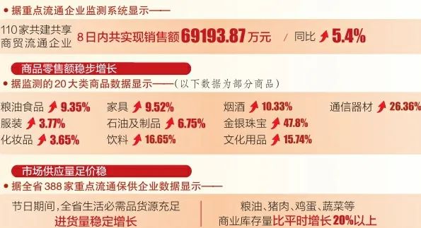 商品零售額穩(wěn)步增長(zhǎng)。各市結(jié)合消費(fèi)者追求綠色健康、彰顯個(gè)性多樣、青睞科技智能等方面的消費(fèi)新需求,通過(guò)發(fā)放政府電子消費(fèi)券或指導(dǎo)商圈集聚營(yíng)銷(xiāo)、品牌商品展銷(xiāo)、特色商品促銷(xiāo)等形式,持續(xù)拉動(dòng)消費(fèi)增長(zhǎng)。據(jù)了解,全省各大商場(chǎng)節(jié)日禮盒、時(shí)令水果、糖果糕點(diǎn)、地方土特產(chǎn)、健康保健品、牛奶、飲料、煙酒等銷(xiāo)售旺盛。據(jù)監(jiān)測(cè)的20大類商品數(shù)據(jù)顯示,糧油食品、服裝、化妝品、家具、石油及制品同比分別增長(zhǎng)9.35%、3.77%、3.65%、9.52%和6.75%;飲料、煙酒、金銀珠寶、文化用品、通信器材等實(shí)現(xiàn)了兩位數(shù)以上的增長(zhǎng),分別為16.65%、10.33%、47.8%、15.74%和26.36%。
