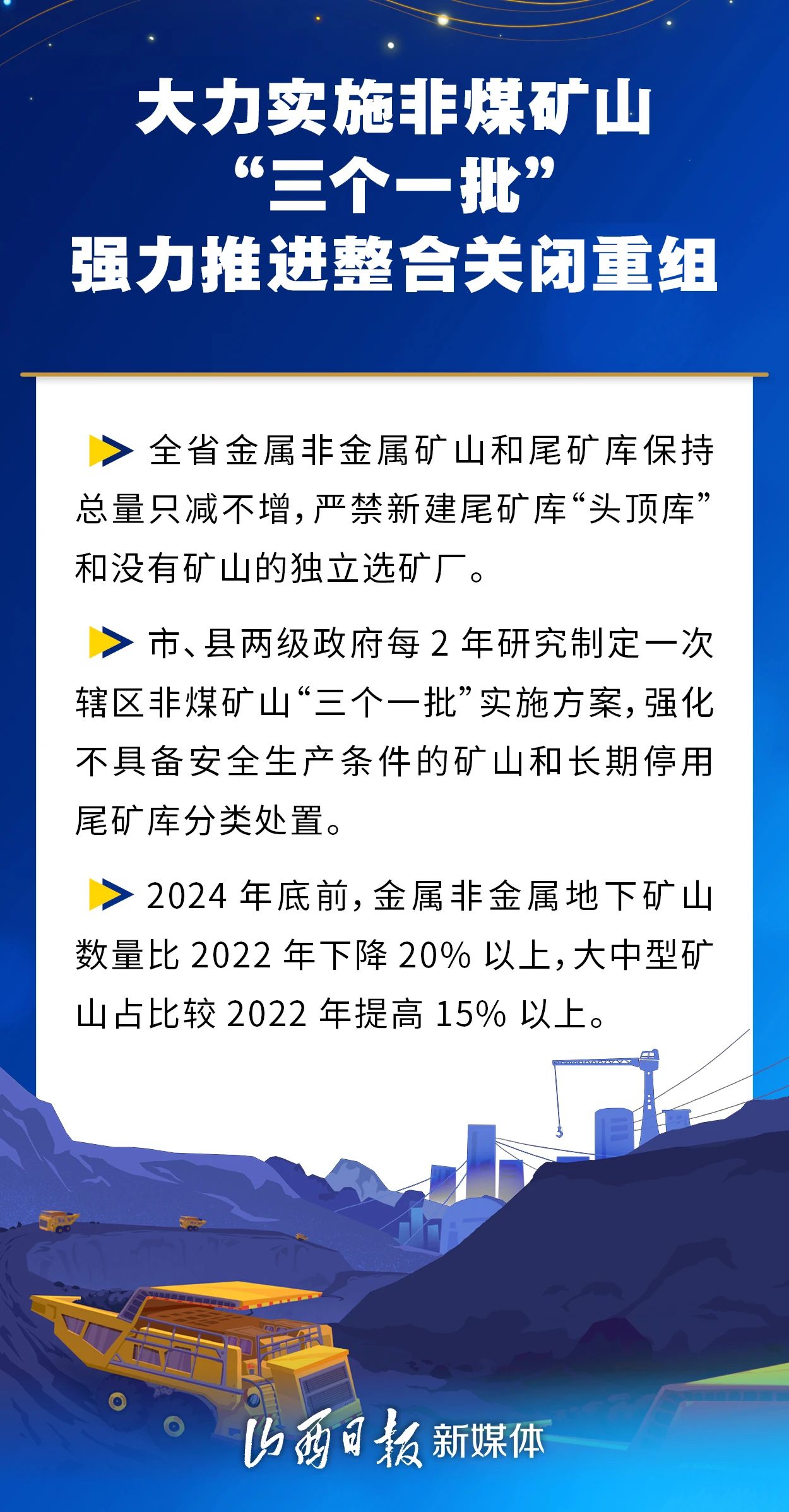 近日,省委、省政府印發(fā)《山西省進(jìn)一步加強(qiáng)礦山安全生產(chǎn)工作措施》,為全面提升礦山安全保障能力,加快發(fā)展礦山新質(zhì)生產(chǎn)力,持續(xù)推動(dòng)山西礦山高質(zhì)量轉(zhuǎn)型發(fā)展,我省將重點(diǎn)在以下幾個(gè)方面優(yōu)化協(xié)同、強(qiáng)基固本、蓄勢(shì)賦能。