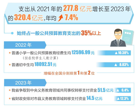 本報訊(記者任志霞)6月13日,記者從省財政廳獲悉,全省義務(wù)教育支出從2021年的277.8億元增長至2023年的320.4億元,年均增長7.4%,始終占一般公共預算教育支出的35%以上,義務(wù)教育優(yōu)質(zhì)均衡發(fā)展得到切實保障。