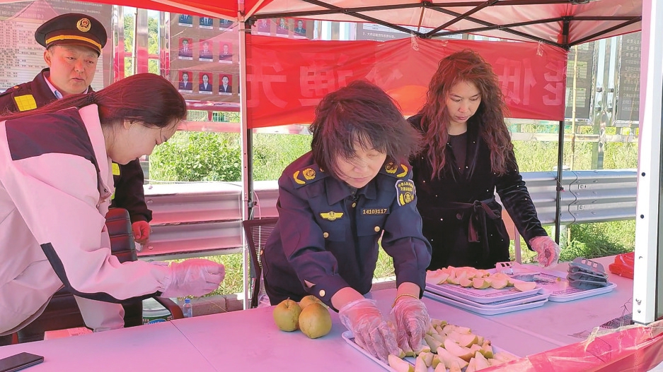 志愿者為游客贈送玉露香梨。