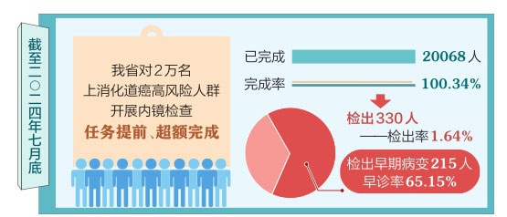 截至2024年7月底,對2萬名上消化道癌高風險人群開展內鏡檢查任務提前、超額完成。全省2萬名篩查任務,已完成20068人,完成率100.34%;檢出330人,檢出率1.64%;檢出早期病變215人,早診率65.15%。