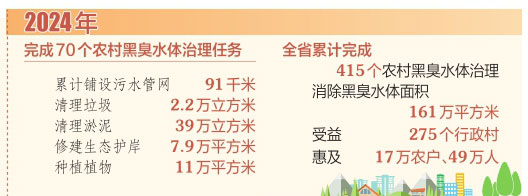 我省對(duì)農(nóng)村生態(tài)環(huán)境治理工作高度重視,2024年政府工作報(bào)告提出,要“完成50個(gè)農(nóng)村黑臭水體治理任務(wù)”。一年來(lái),我省各級(jí)各部門積極投入力量,挖掘打通資源,用心用情用力辦好這一民生實(shí)事。生態(tài)環(huán)境部門更是自加壓力,完成了70個(gè)農(nóng)村黑臭水體治理任務(wù),累計(jì)鋪設(shè)污水管網(wǎng)91千米,清理垃圾2.2萬(wàn)立方米,清理淤泥39萬(wàn)立方米,修建生態(tài)護(hù)岸7.9萬(wàn)平方米,種植植物11萬(wàn)平方米,促進(jìn)重點(diǎn)關(guān)注水體所在村莊生態(tài)環(huán)境質(zhì)量明顯改善,并以標(biāo)志性成果讓農(nóng)民群眾對(duì)治理效果可感可及,真正讓農(nóng)村黑臭水體治理工程成為普惠的民生工程。