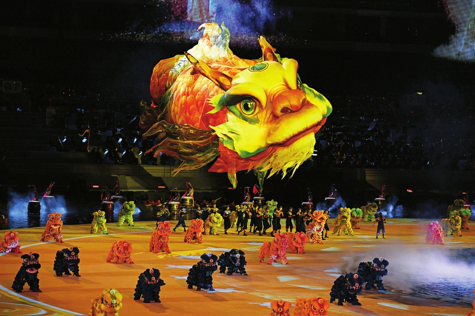 第十五屆全國運(yùn)動(dòng)會(huì)吉祥物“喜洋洋”和“樂融融”在開幕式現(xiàn)場(chǎng)表演。圖片均為開幕式表演現(xiàn)場(chǎng)。 本版圖片均來源新華社